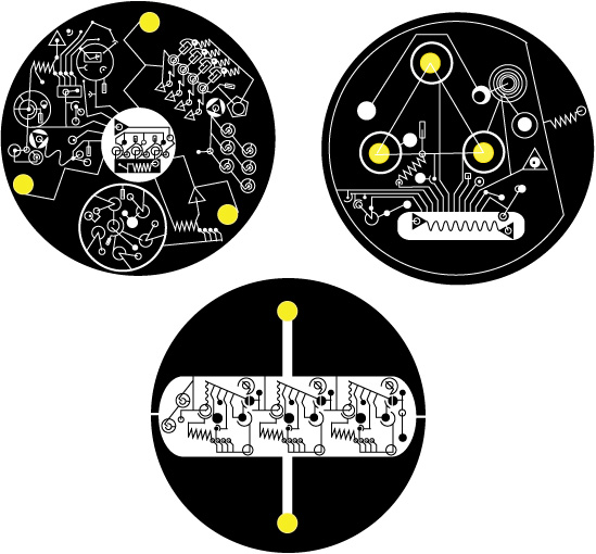 Here are what will likely be the final tray etchings. These will be 3.5′ in diameter and the yellow circles will be where brass end nuts are used to attach them to the tray itself.
